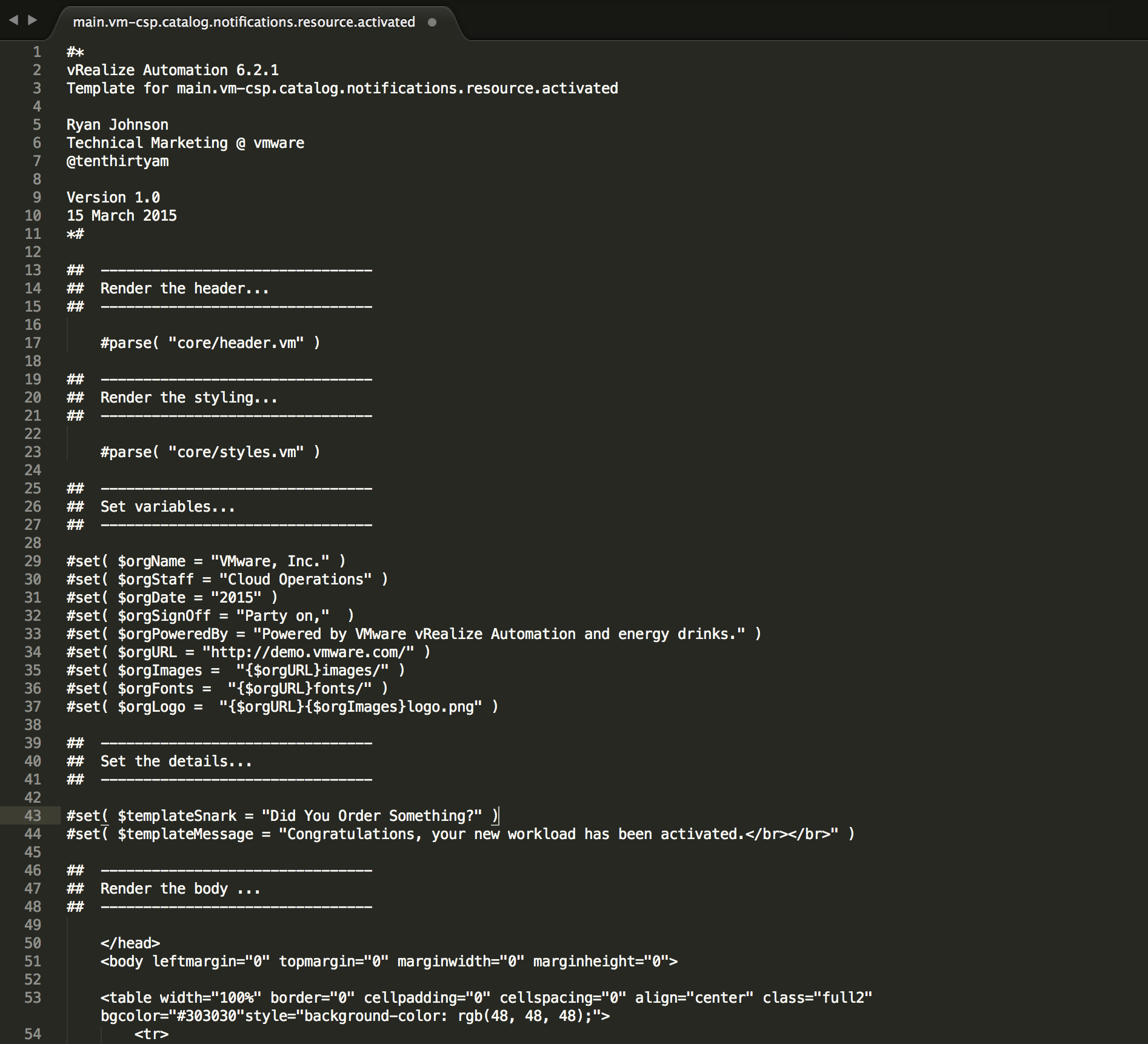 ## -------------------------------- ## Set variables... ## -------------------------------- # set( $orgName = "VMware, Inc." ) # set( $orgStaff = "Cloud Operations" ) # set( $orgDate = "2015" ) # set( $orgSignOff = "Party on," ) # set( $orgPoweredBy = "Powered by VMware vRealize Automation and energy drinks." ) # set( $orgURL = "<http://demo.vmware.com/>" ) # set( $orgImages = "{$orgURL}images/" ) # set( $orgFonts = "{$orgURL}fonts/" ) # set( $orgLogo = "{$orgURL}{$orgImages}logo.png" )You can call these variables within your template at any time, like so: