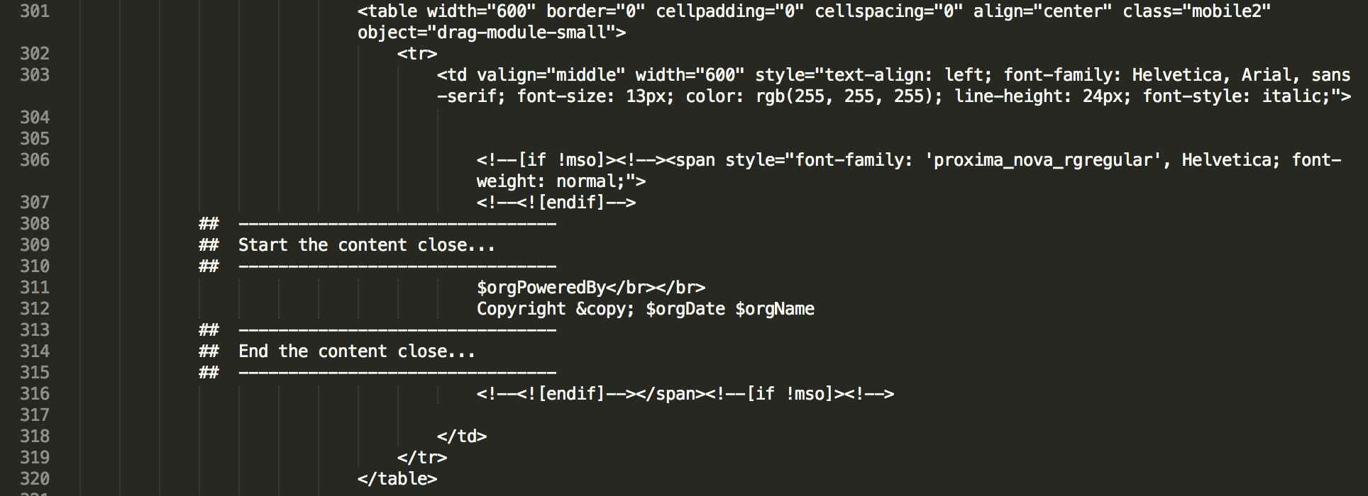 ## -------------------------------- ## Start the content close... ## -------------------------------- $orgPoweredBy Copyright &copy; $orgDate $orgName ## ------------------------------- ## End the content close... ## -------------------------------Now, I know what you're thinking. "Can I set these as global variables in simply parse that file and call the variable when I need it?" Unfortunately, not at this time.