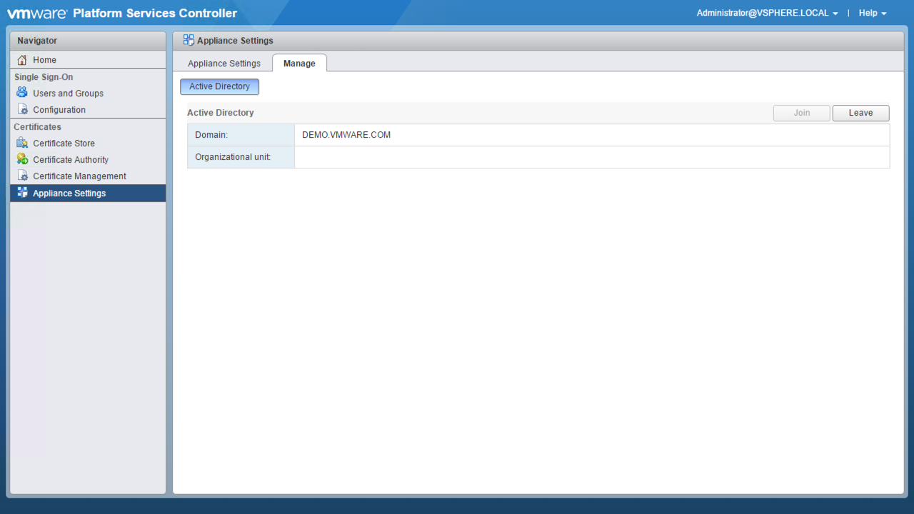 In this section you can join the Platform Services Controller to your Active Directory domain, similar to how you can do so in the vSphere Web Client's System Configuration > Node option. This is just way simpler.