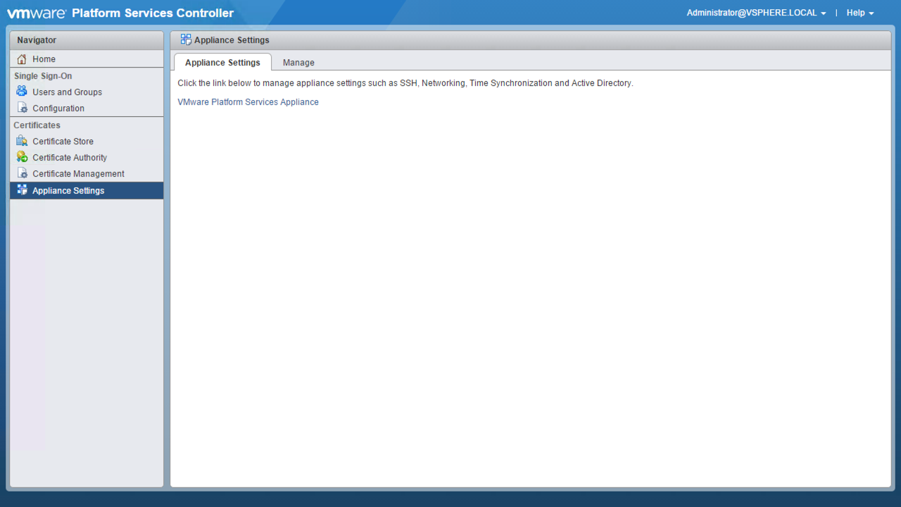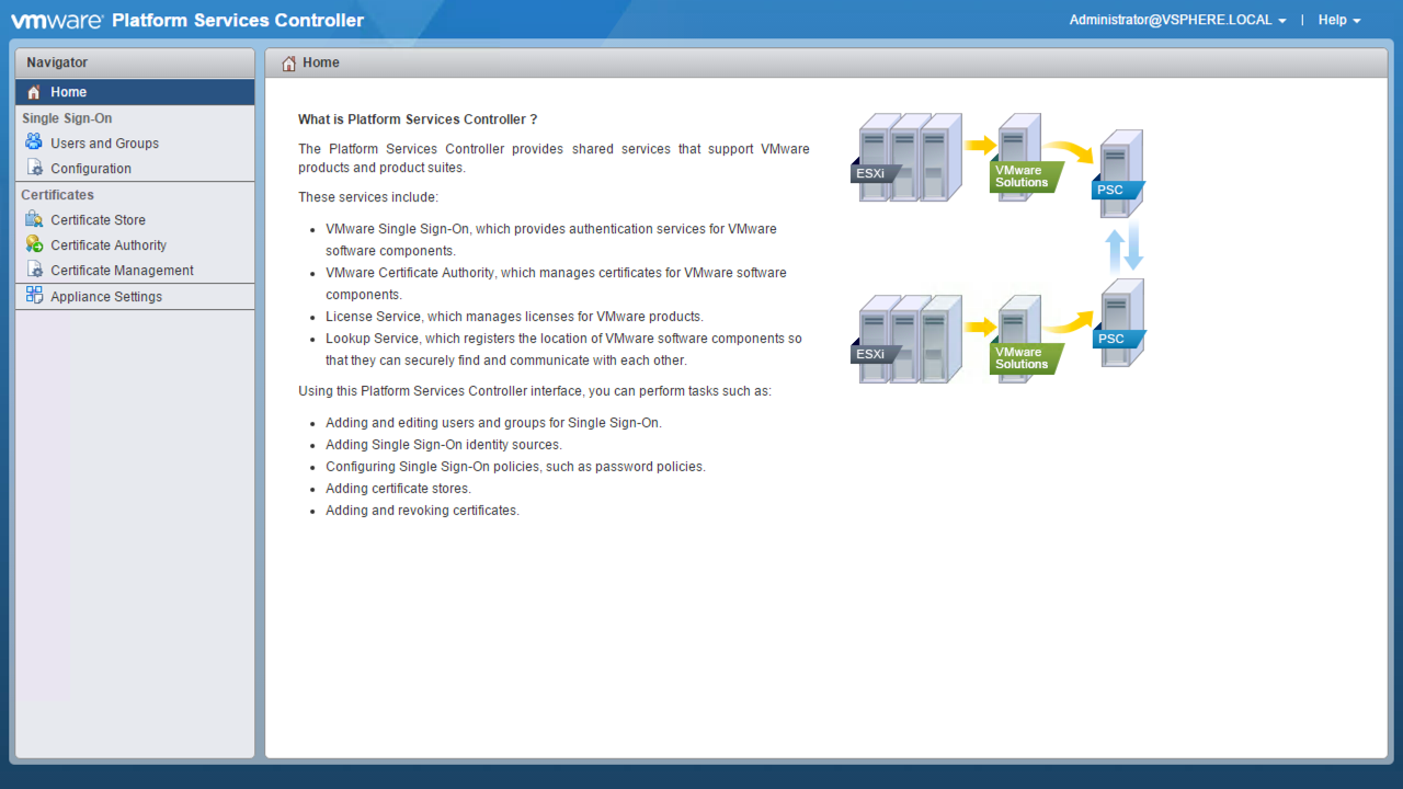 Once you've logged into the the Platform Services Controller Interface, you'll be directed to the Home section.