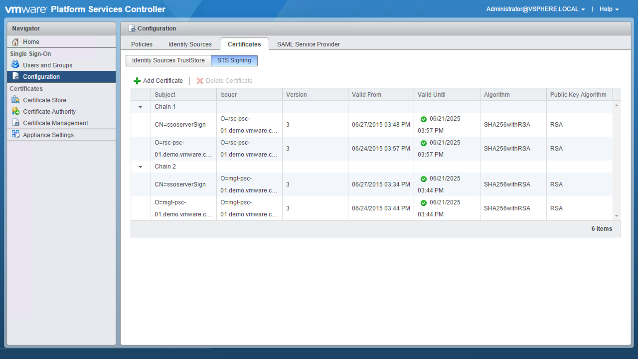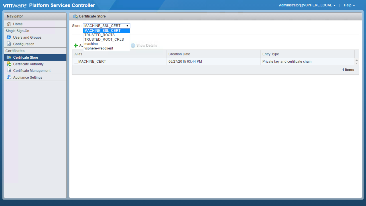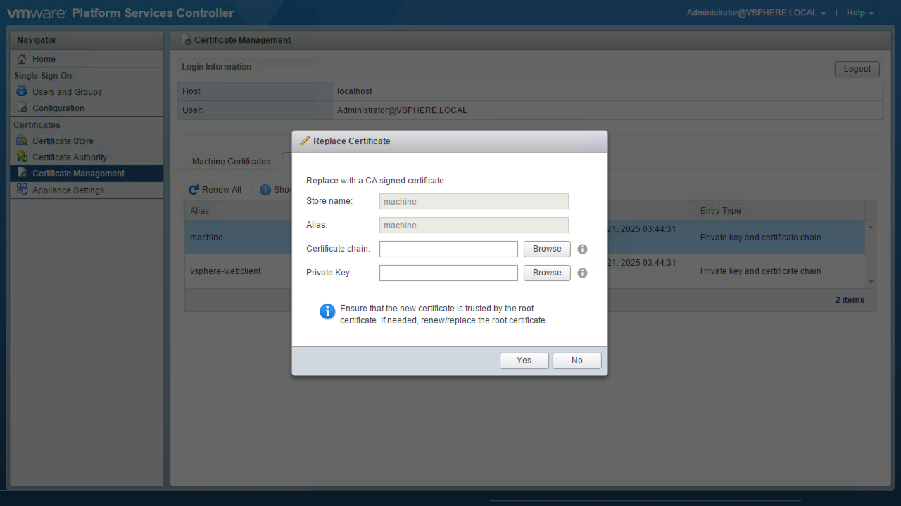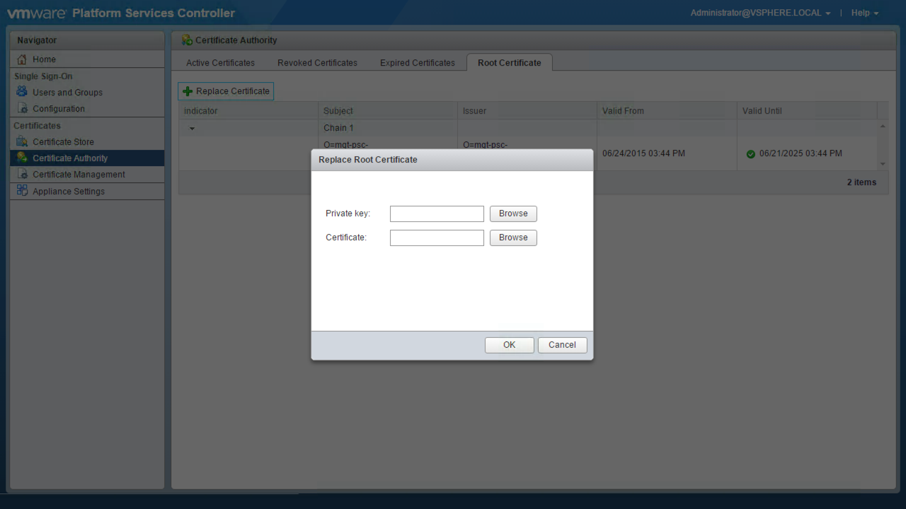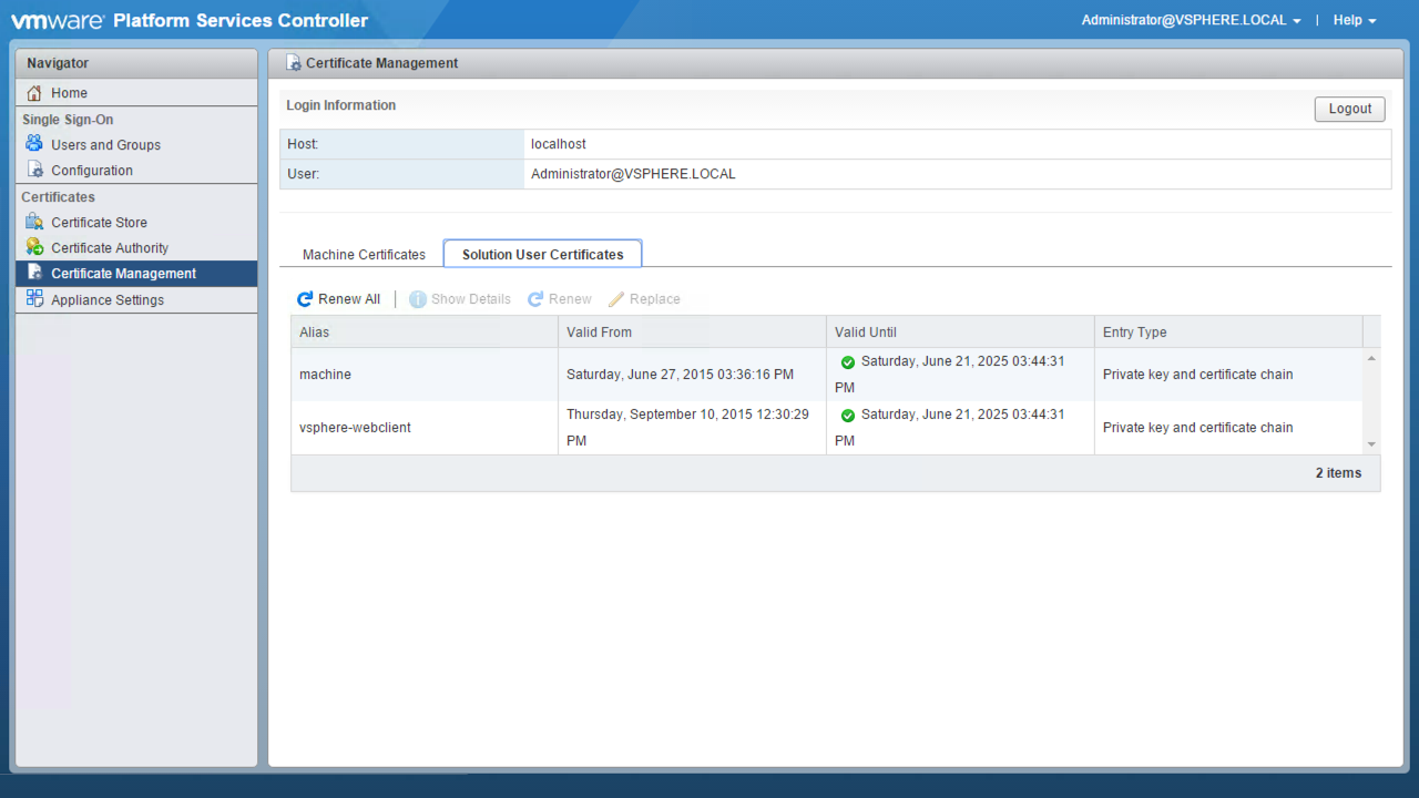 You can also renew and replace both Machine SSL Certificates and Solution User Certificates in from within the Platform Services Controller Interface (equivalent to the options to replace Machine SSL Certificates and Solution User Certificates in Certificate Manager).