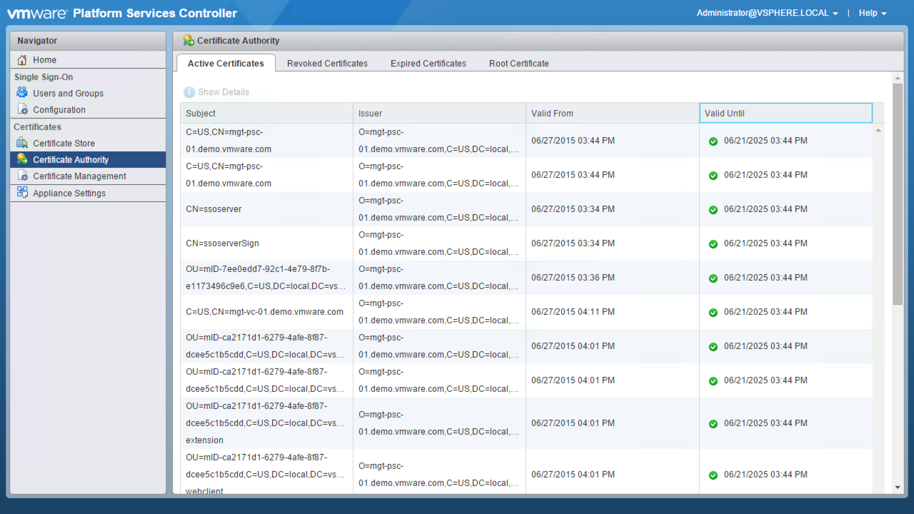 Now, in vCenter Server 6.0 Update 1 you have the option to manage portions of the VMware Certificate Authority using the Platform Services Controller Interface, such as, viewing active, revoked and expired certificates as well as replacing the root signing certificate for the VMCA (equivalent to Option 2 in the Certificate Manager).