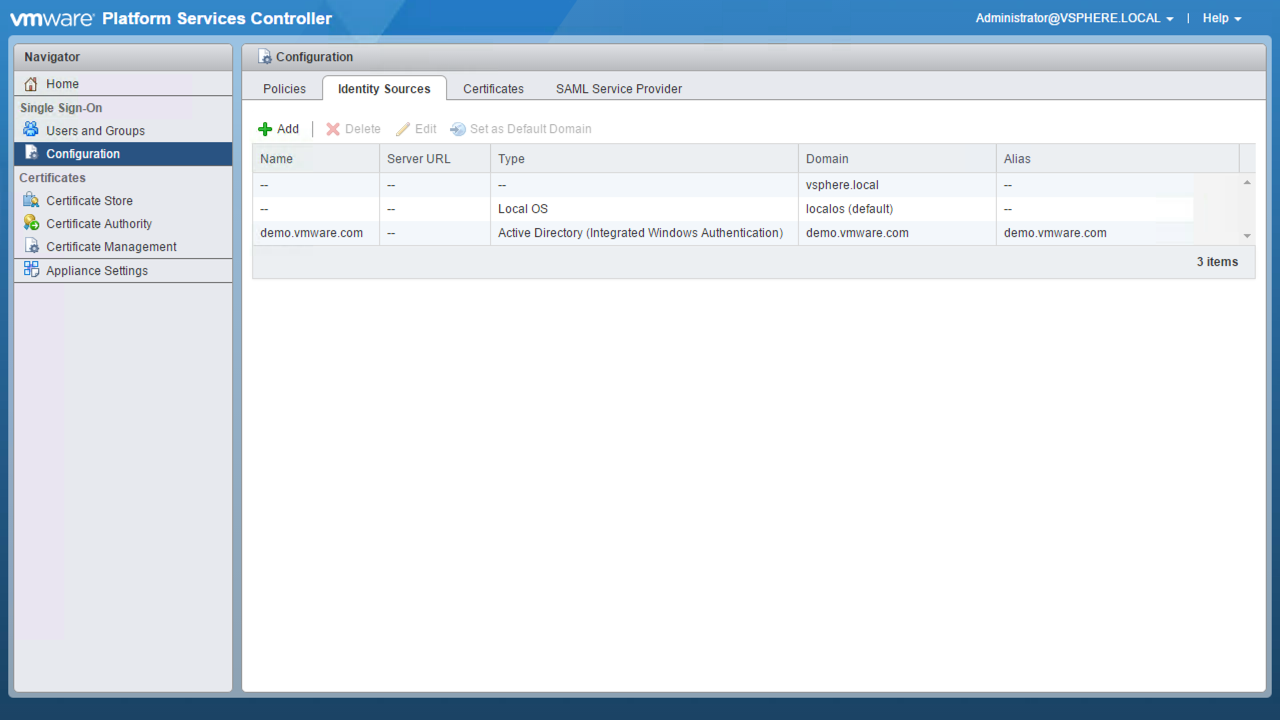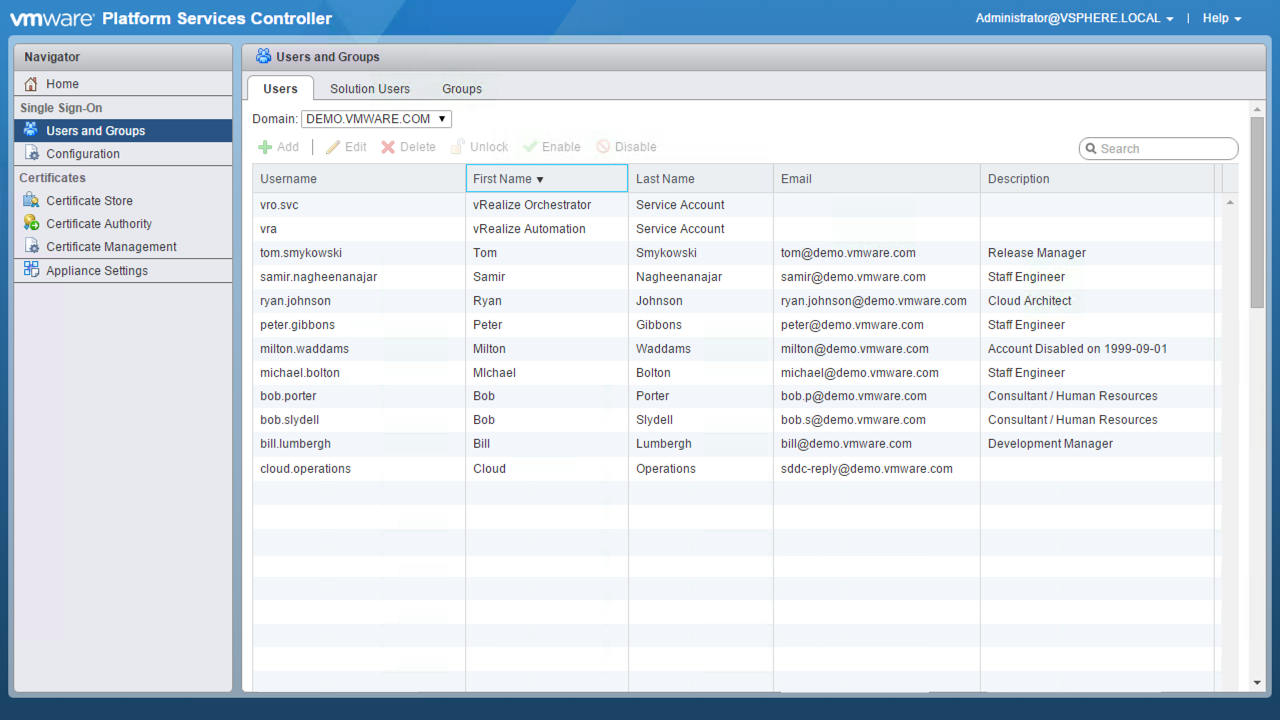 Manage users, groups and registered solution users in the Single Sign-On domain (e.g., vsphere.local) by directly connecting to the Platform Services Controller.