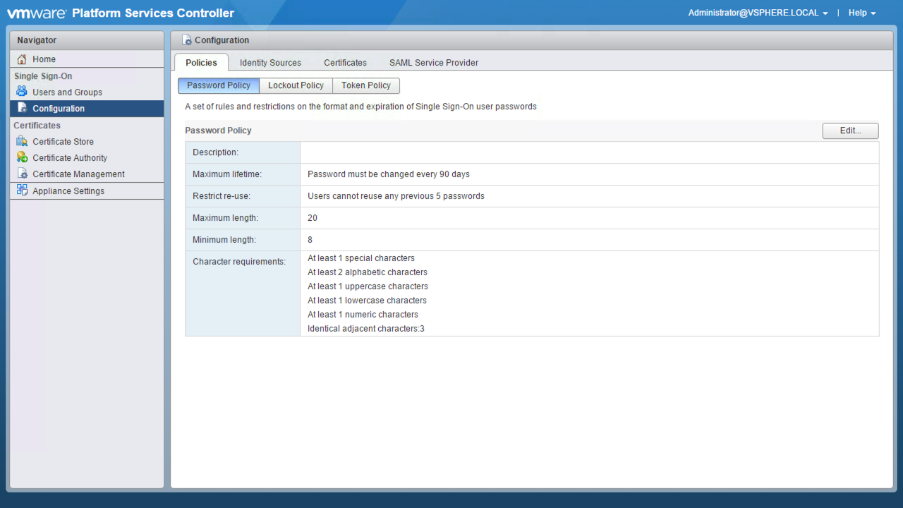 Recall that beginning with vSphere 6.0, vCenter Single Sign-On is part of the Platform Services Controller. The Platform Services Controller contains the shared services that support vCenter Server and vCenter Server components. vCenter Single Sign-On is essentially an authentication broker and security token exchange infrastructure. When a user or a solution user authenticates successfully to vCenter Single Sign-On, that user receives SAML token. Thereafter, the user can use the SAML token to authenticate to vCenter services and perform any actions that user has privileges. In vSphere 6.0, the vCenter Server management group of services needed to be deployed in order to administer and configure Single Sign-On through the vSphere Web Client. In vCenter Server 6.0 Update 1 the Platform Services Controller Interface provides you direct access to the configuration. This can be useful during initial deployment configuration or even troubleshooting exercises.